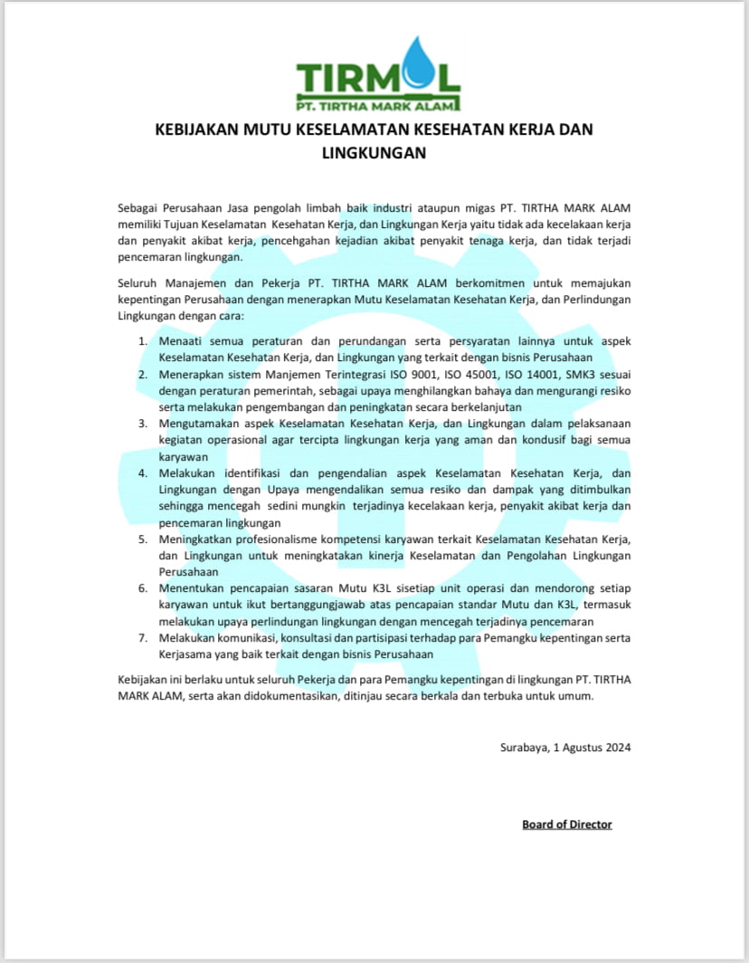 PT. TIRTHA MARK ALAM yang bergerak di bidang Water Treatment Management siap memberikan support terbaik. Menjadi bagian kewajiban menjaga ekosistem dan lingkungan dari limbah cair hasil buangan limbah rumah tangga, industri sekala kecil ataupun besar dan MIGAS.